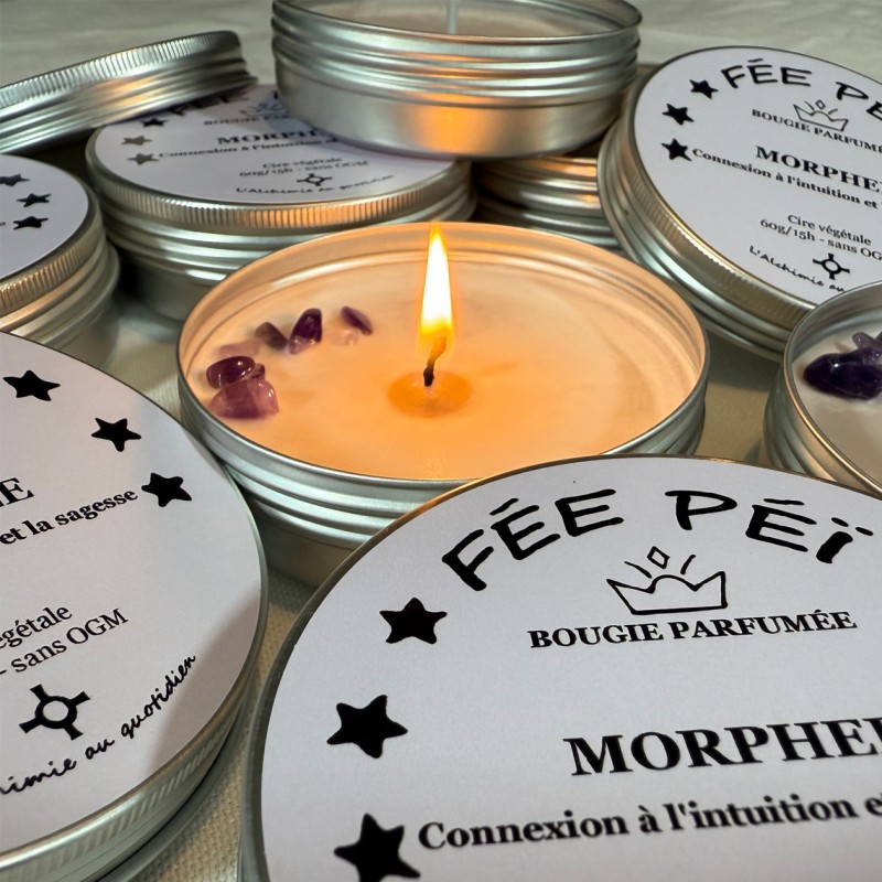 La touche Alchimique (Romarin/Or, coquelicot, teinture d'amethyste) en fait une bougie subtile qui invite à ecouter nos intuitions, notre "petite voix" et nos Rêves.
