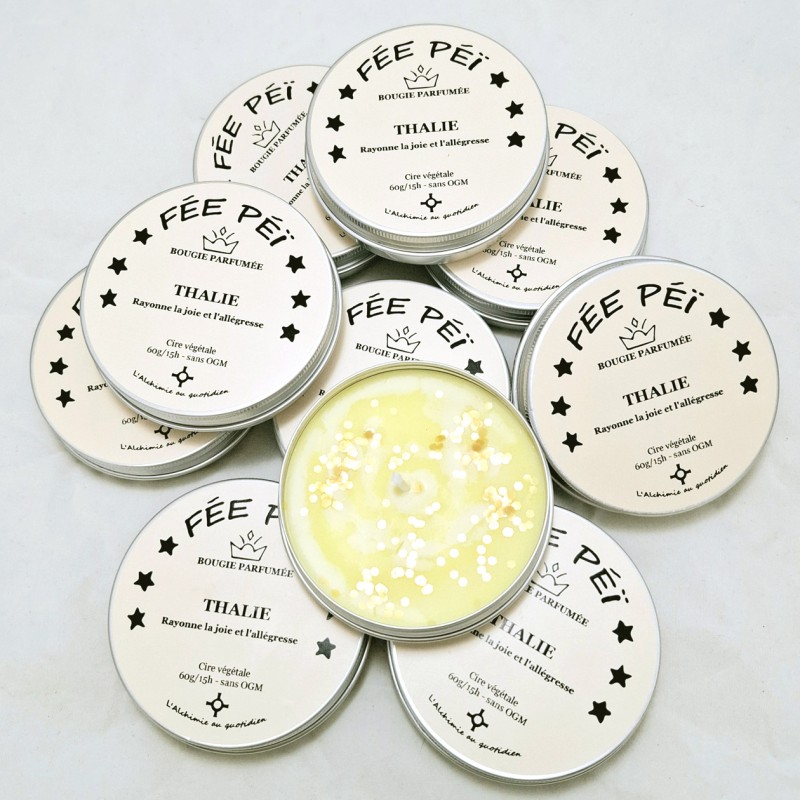 La touche Alchimique (benjoin doré, curcuma, citrine) en fait une bougie qui apporte une vibration de joie et de bonne humeur.
